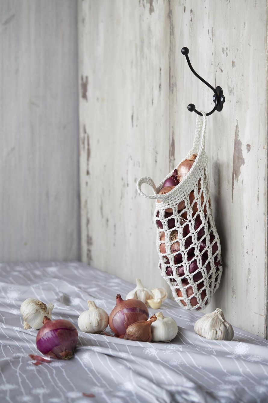 Virkattu pussi on suloinen keittiön kaunistus, ja sipulit pysyvät ilmavassa säilössään hyvinä pitkään. Virkkaa itselle tai lahjaksi!