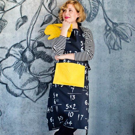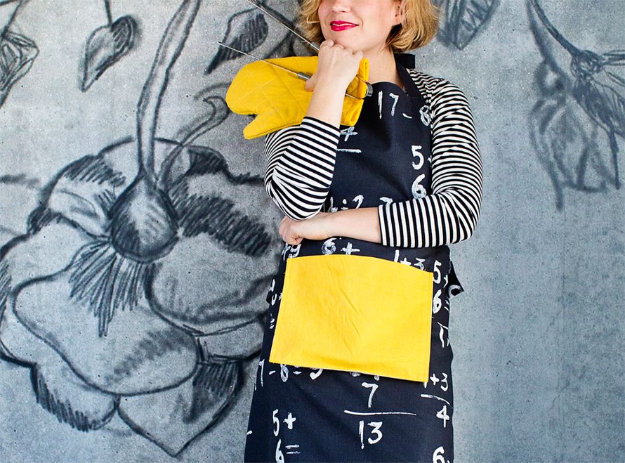 Huristele ompelukoneella grillaajalle kesäksi suojaava essu ja patakintaat.