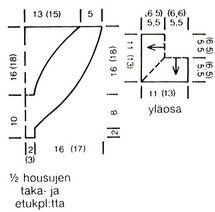Virkkaa sitten takakpl:n vasemmasta nauhasta lähtien rapu-s:ita yläreunaan ja oikeaan nauhaan, käänny 1 kjs:lla ja virkkaa edelleen pitkin lahkeensuuta. Virkkaa samalla tavoin housujen ja nauhojen kaikki reunat.