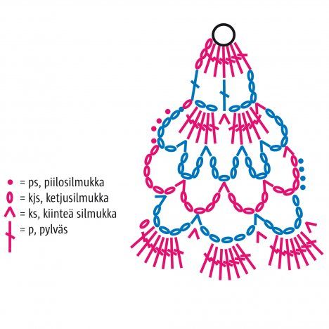 7. krs: 1 kjs, *7 p kjs-kaareen, 1 ks ks:ään*, toista *–*, tee viimeinen ks kjs-kaareen.