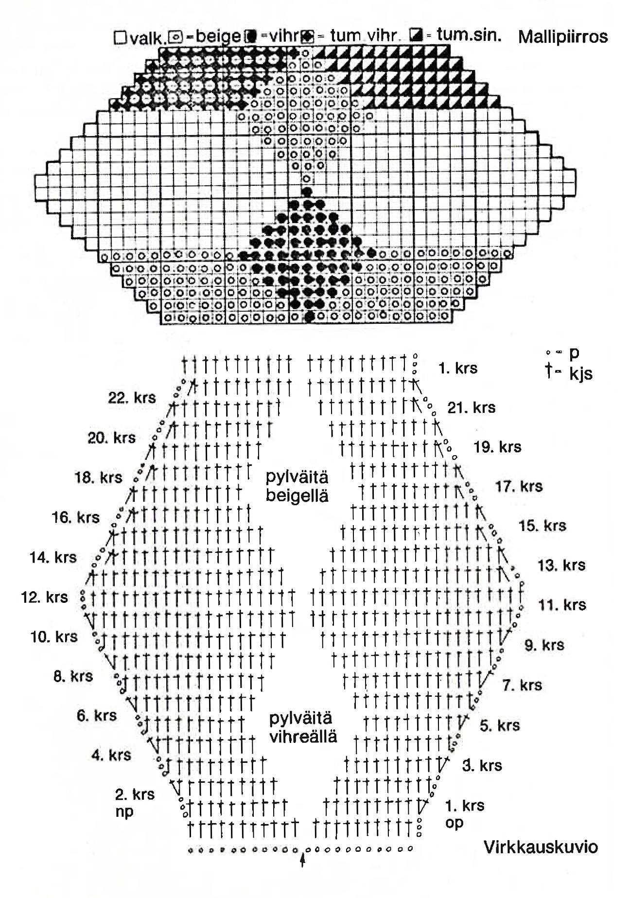 Tarvikkeet: 350 g valkoista, 150 g beigeä, 100 g vihreää, 50 g tummansinistä. ja tummanvihreää lives-konelankaa tai muuta vastaavaa
