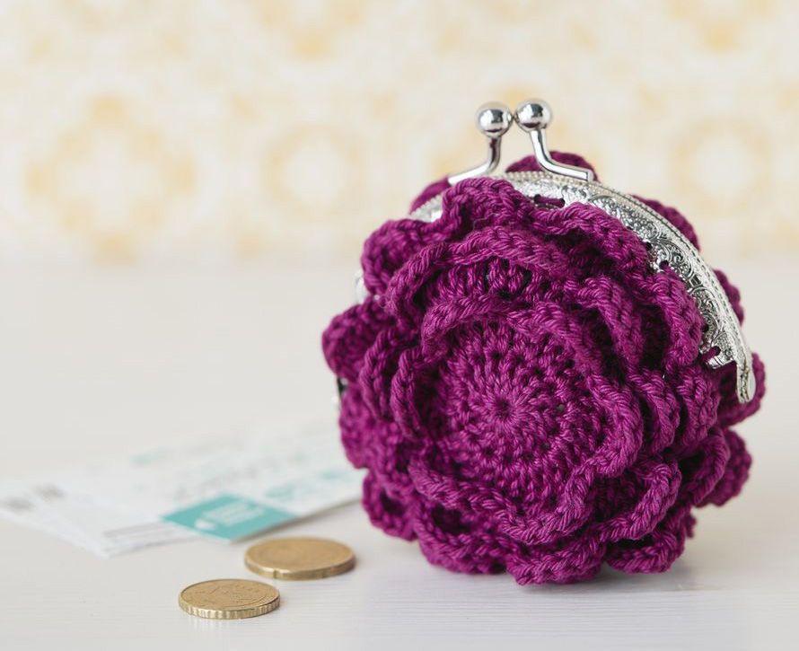 Jos haluat suuremman kukkaron, virkkaa 8. kerroksella pylväitä *3 p, 2 p yhteen silmukkaan*. Toista *-* kerroksen loppuun.