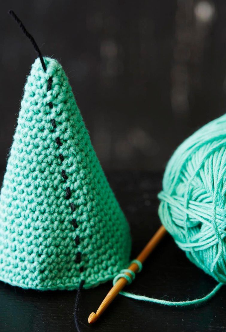 HATTU: Aloita virkkaaminen tonttulakin kärjestä mintunvihreällä langalla. Virkkaa kaksi ketjusilmukkaa. Virkkaa koukusta lukien toiseen silmukkaan