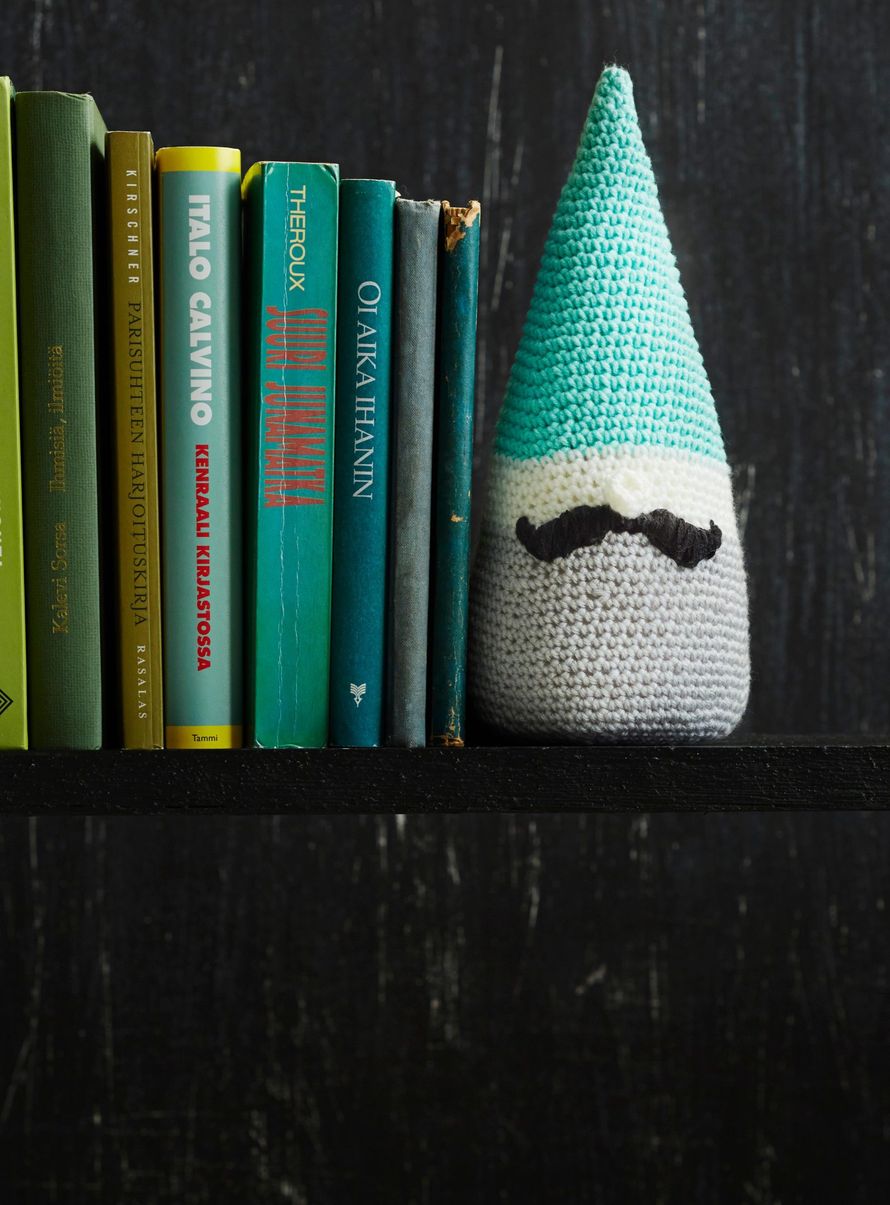 Piia Mettälä virkkasi puuvillalangoista tyylikkään tontun. Viiksivallu käy leluksi, koristeeksi ja kirjatueksi.