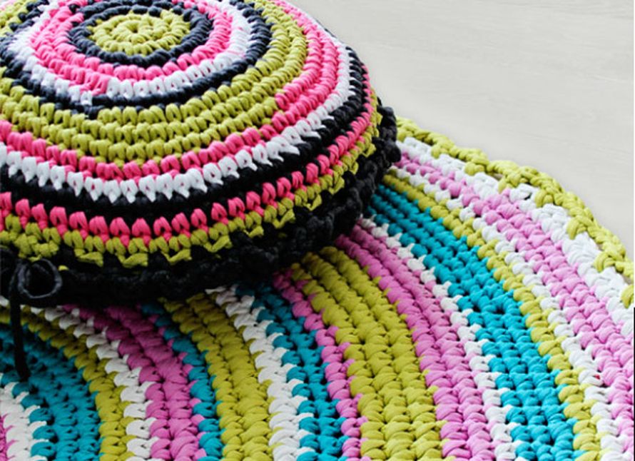 Pirteän värisistä puuvillatrikoista virkattu matto ja tyyny tuovat kotiin leikkimielisen kepeää ilmettä. Katso tästä tarkat ohjeet!