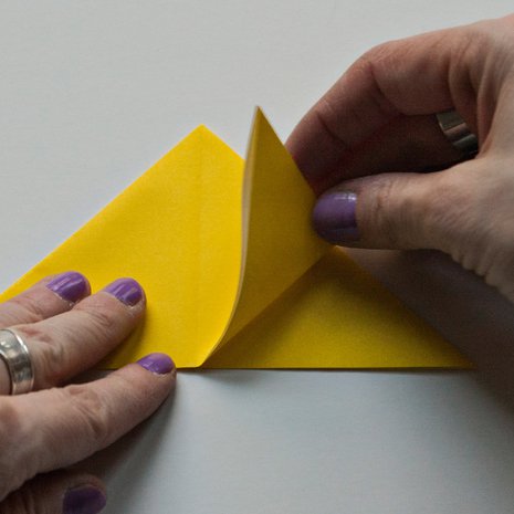 Tarvitset keltaisen origamipaperin 18x18 cm ja oranssin origamipaperin 7,5x7,5 cm.