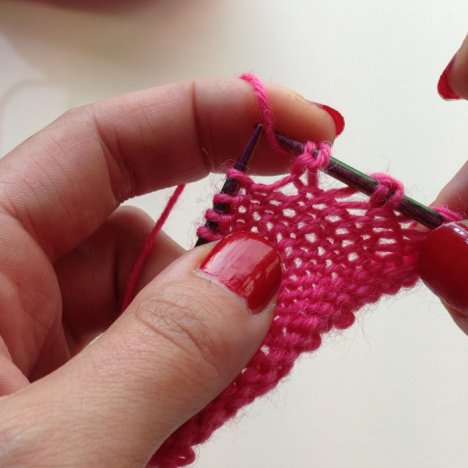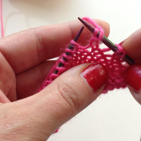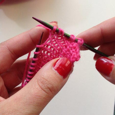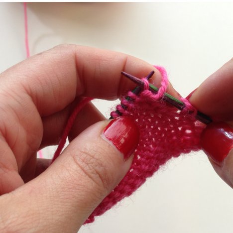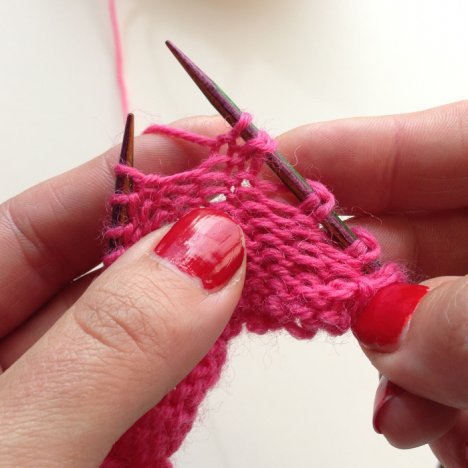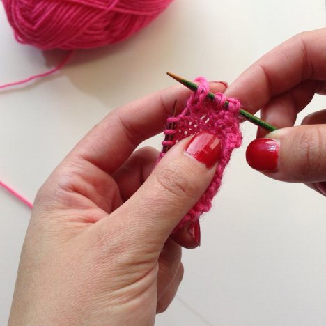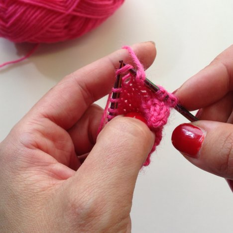 Jätä edellisen kerroksen kaksoissilmukat neulomatta ja käännä työ oikea puoli päällepäin.