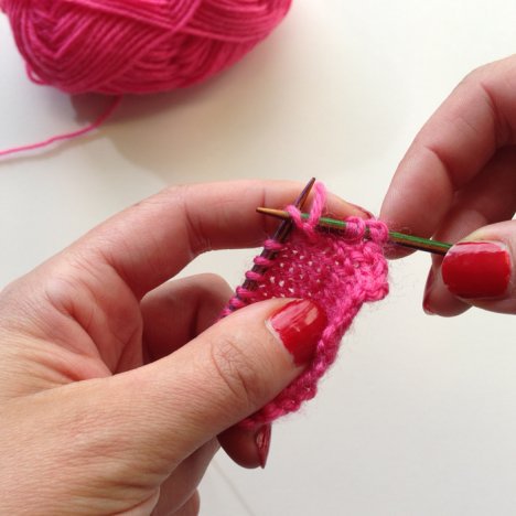 Katso kuvat, kuinka esimerkiksi villasukan tiimalasikantapään lyhennettyjen kerrosten ensimmäiset silmukat neulotaan.