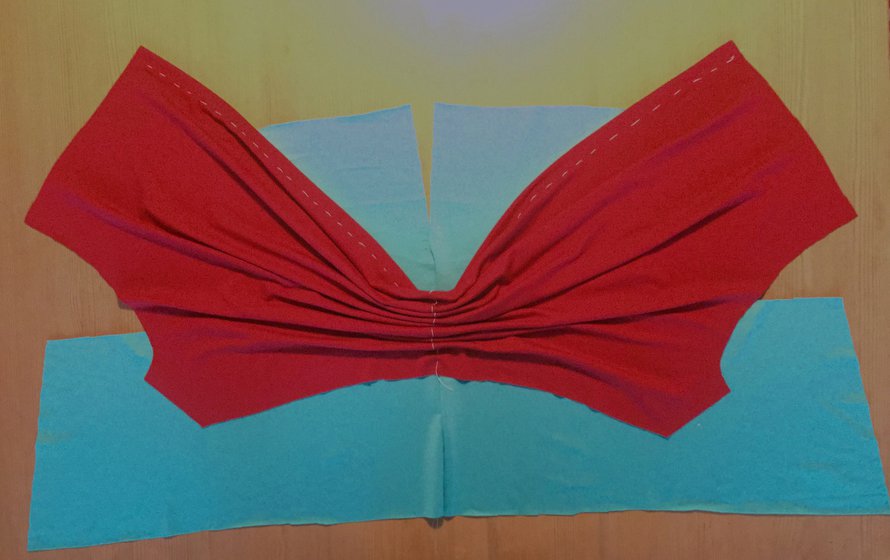 4. Aloita etukappaleen yläreunasta (= etureuna) KE:n merkkilangan kohdasta ja työnnä etukappaletta alaspäin samalla kooten sitä pienille laskoksille ja nipuksi käteesi. Yläreuna kaartuu etukappaleen etureunoiksi.