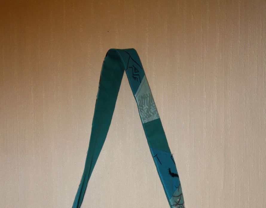 Turkoosi-sävyisistä kankaista crazy quilting -tekniikalla tehty hauska käsilaukku. Vuoritettu. Leveys 26 cm, korkeus 15 cm, olkahihna 63 cm.