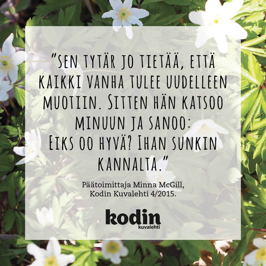 Tyttären viisaus 1.5.2015 klo 19:04 "Sen tytär jo tietää, että kaikki vanha tulee uudelleen muotiin. Sitten hän katsoo minuun ja sanoo: Eiks oo hyvä? Ihan sunkin kannalta." Päätoimittaja Minna McGill, KK 4/15 Tilaa Kodin Kuvalehti Tilaa Lue digilehtenä