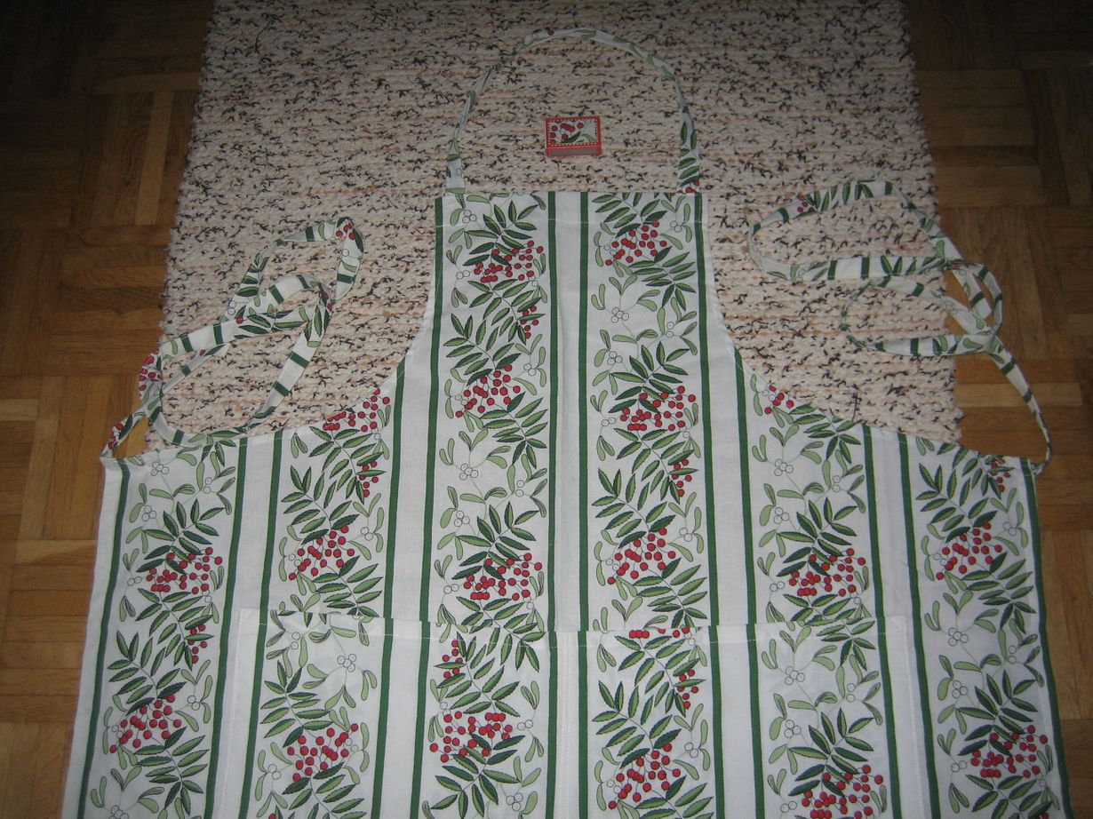 Reilunkokoinen esiliina, jossa on pitkät nauhat solmittavaksi eteen. Taskussa jouluyllätys.