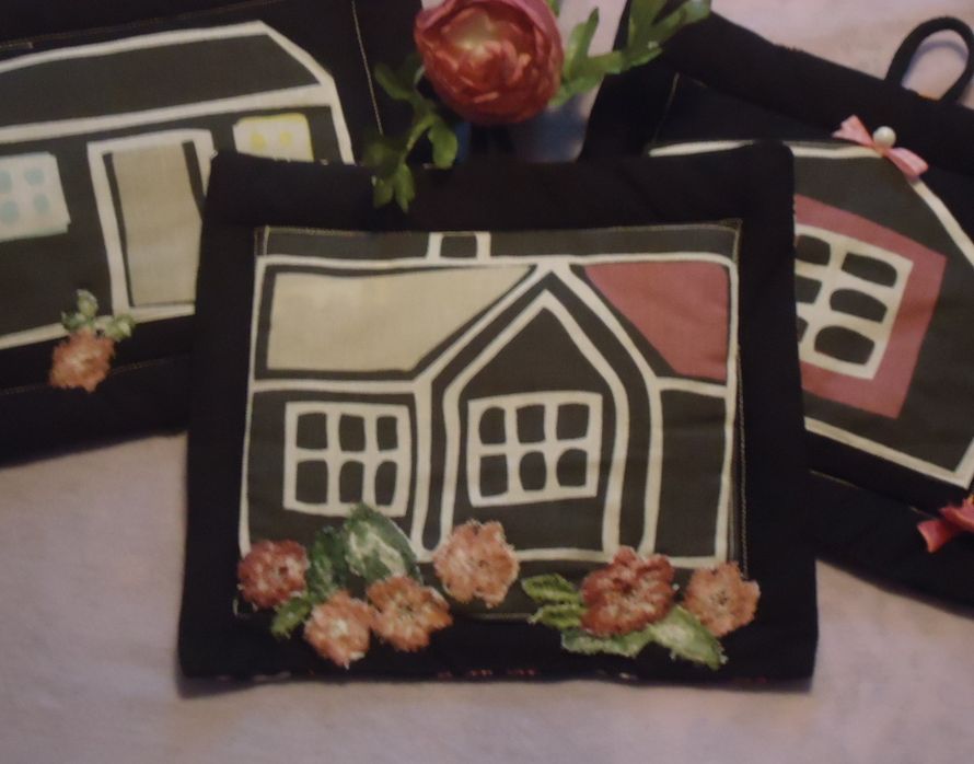 Erilaisia taloja mustalla pohjalla. Toisissa paljon kukkia ja toisessa muutama. Kisuilla on erilaiset mekot tai housut. Sisus on fiiberiä. Tulppaaneissa on peruskuvio. Ne ovat hieman ohuemmat. Niissä on termo-vuori!