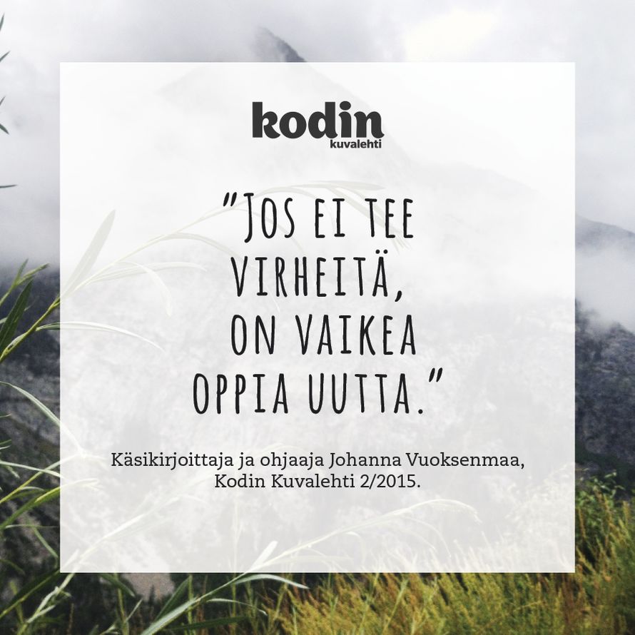 Virheistään oppii 6.3.2015 klo 14:50 "Jos et tee virheitä, on vaikea oppia uutta." Käsikirjoittaja ja ohjaaja Johanna Vuoksenmaa, KK2/15 Mikä on ollut sinun paras virheesi, josta opit eniten? Tilaa Kodin Kuvalehti oivallus Tilaa Lue digilehtenä
