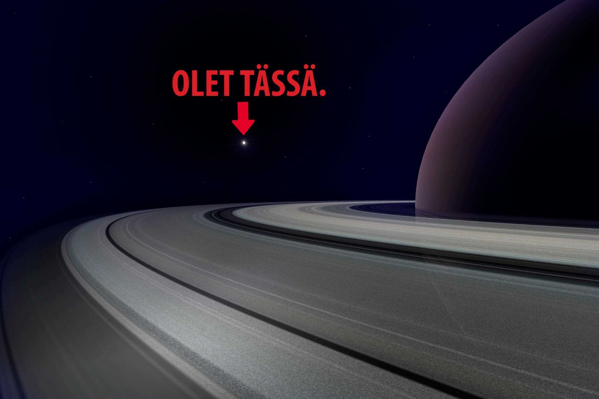 Kuvassa näkyvät suuret renkaat ovat Saturnuksen renkaita. Maapalloon osoittaa tuo pieni nuoli. Siellä avaruuden keskellä me kaikki killumme!