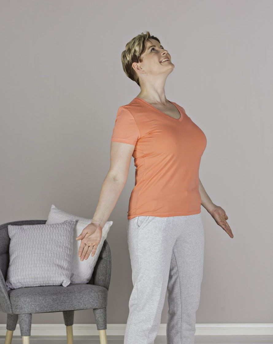 Pienellä liikkeellä on iso vaikutus: saat selkärankasi ojennukseen ja ryhtisi paremmaksi. Ehkäiset mahdollisia niska- ja selkäkipuja.