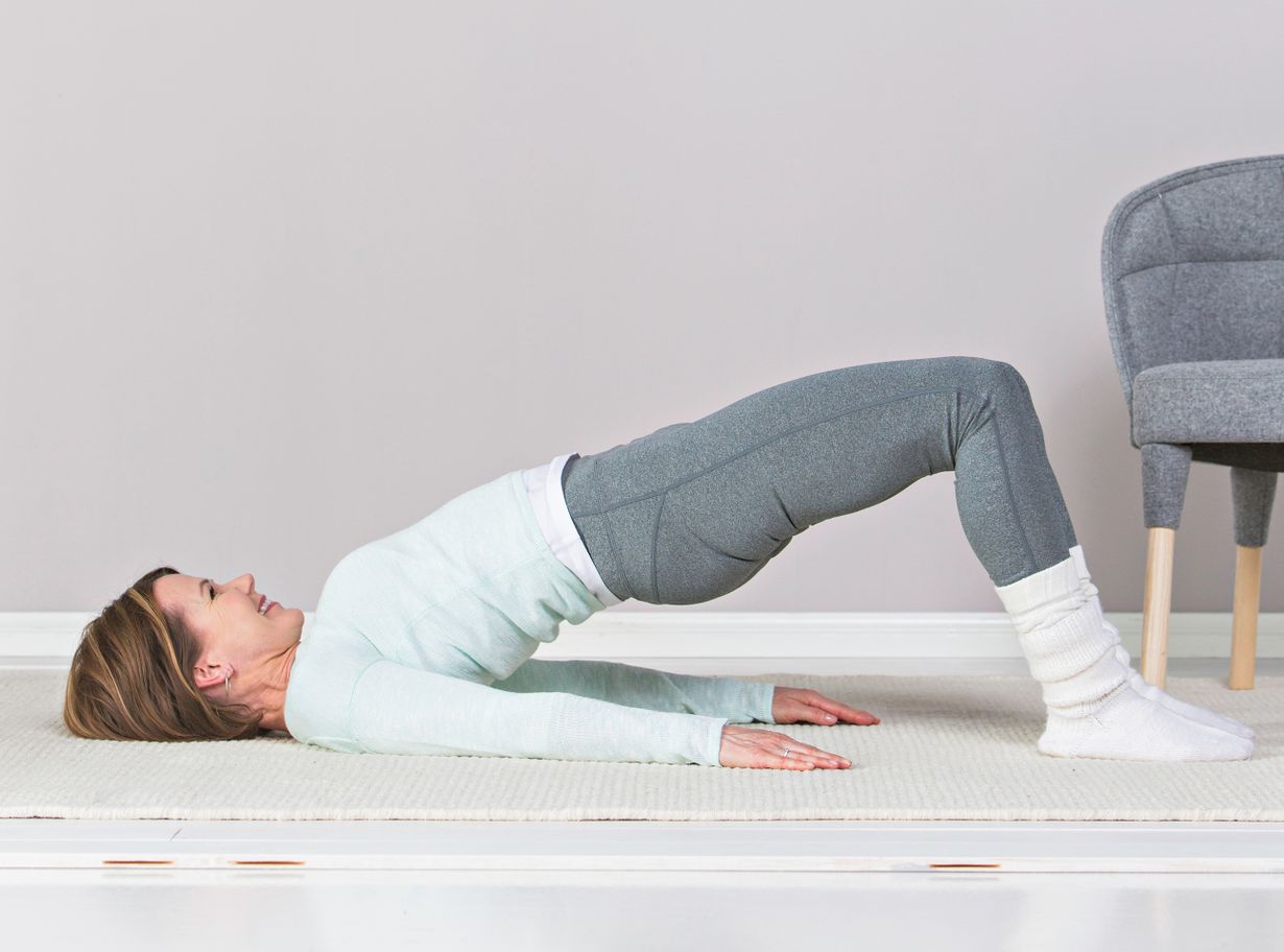 Vahvista samalla syviä vatsalihaksia: Nosta lantio uloshengityksen aikana ylös vatsaa supistaen ja jännitä pakaroita. Laske lantio sisäänhengityksellä alas.