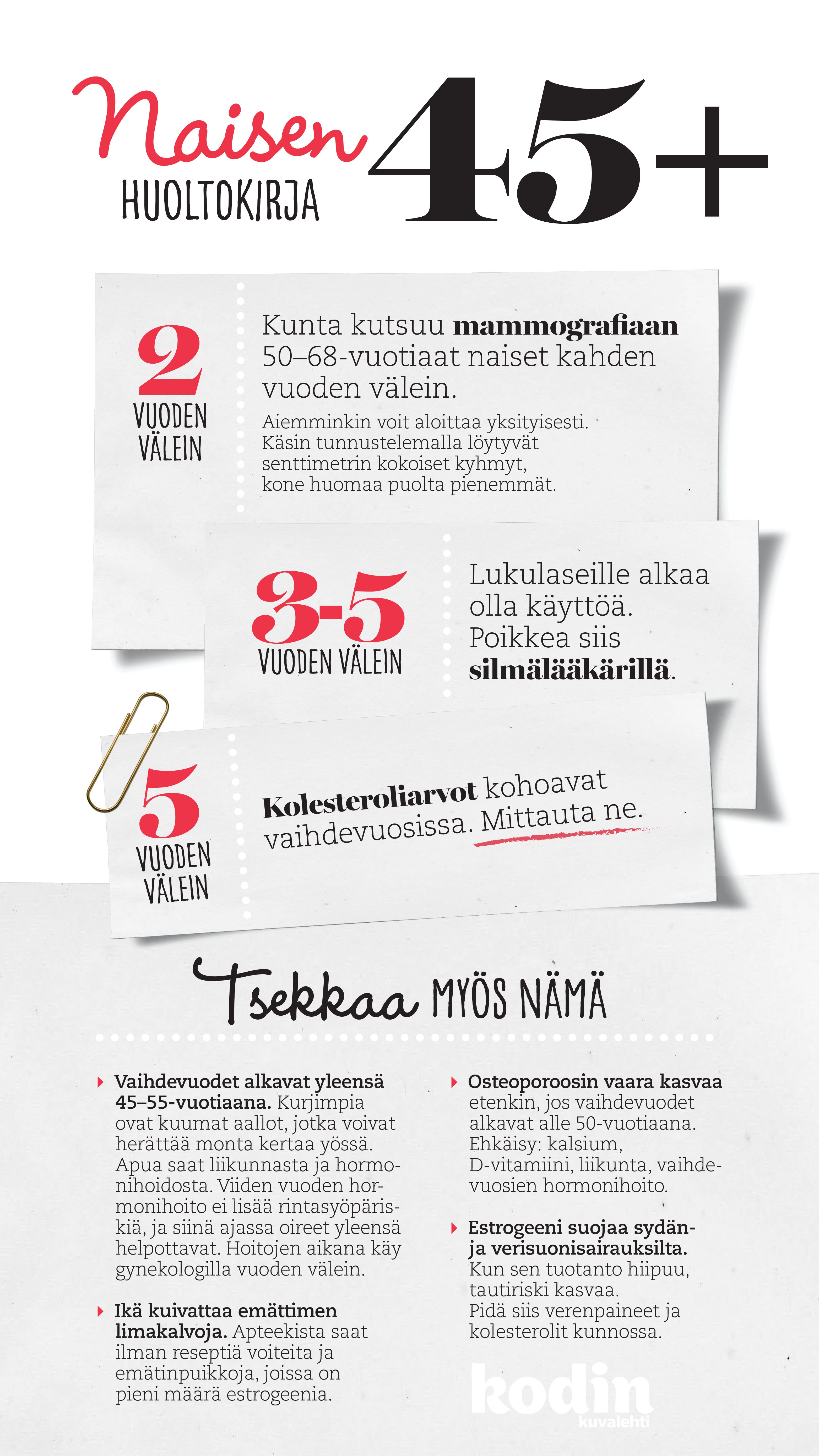 Lähteet: Naistentautien ja synnytysten erikoislääkärin Marjut Laurikka-Routin haastattelu, Duodecim, Muistiliitto, Suomen Diabetesliitto, Suomen hammaslääkäriliitto ja UKK-instituutti.