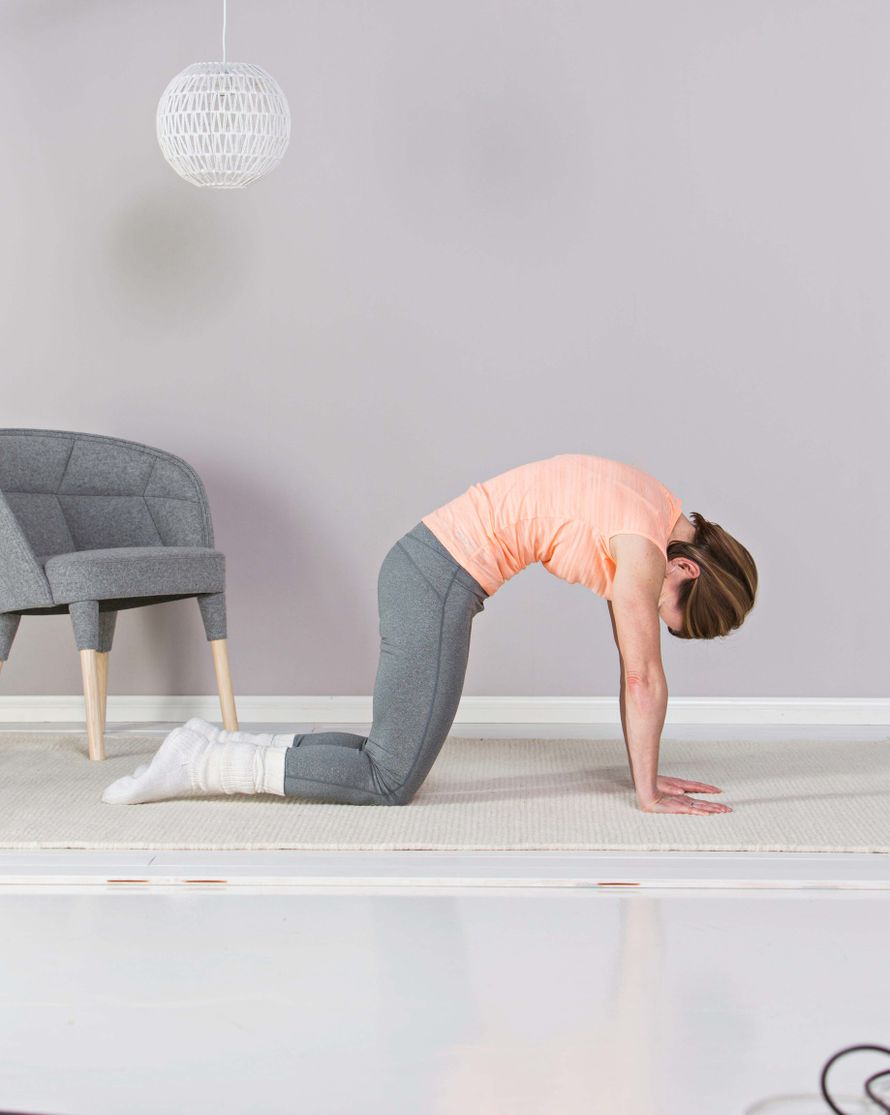 Käy konttausasentoon, kämmenet olkapäiden alla ja polvet lantion leveydellä. Pyöristä selkä uloshengityksellä, vedä napaa selkärankaa kohti ja paina leuka rintaan. Pidä hetki. Vedä sisäänhengityksellä selkä kevyesti notkolle ja nosta leuka ylös.