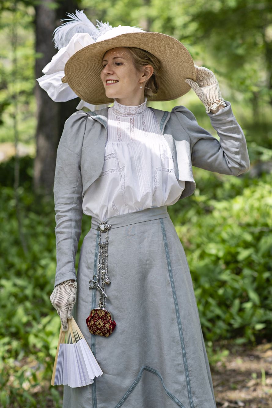 Kuinka opit ompelemaan vuosisadan vaihteen tyylisiä asuja? ”Vanhoista tyyleistä innostuin, kun kuulin historian elävöittämisestä. Sen harrastajat luovat historiallisen miljöön uudelleen ja pukeutuvat ajan tyylille uskollisesti. Sain vinkkejä amerikkalaiselta mittatilausompelijalta ja ymmärsin, että nykyajan käsin ommelluissa couture-mittatilausvaatteissa käytetään samoja tekniikoita kuin entisaikoina, kun kaikki vaatteet tehtiin vielä käsin. Niinpä aloin soveltaa. Haluan jakaa muillekin tietoa vanhoista tekniikoista ja tyyleistä.”