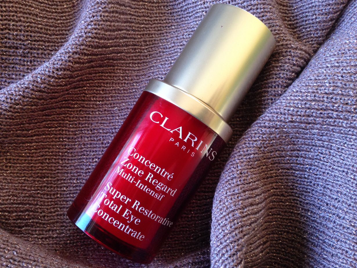 Clarins Super Restorative Total Eye Concentrate on ihoa vahvistava silmänympärysvoide. Valmistajan mukaan se vähentää turvotusta ja tummien silmänalusien näkymistä, silottaa naururyppyjä ja silmien välin ryppyjä. Lisäksi se sisältää D-pantenolia, joka ehkäisee ripsien haurastumista.