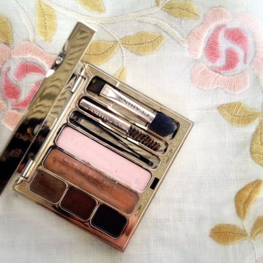 Clarinsin Kit Pro Palette väittää sisältävänsä kaiken, mitä ammattilaistason kulmakarvoihin tarvitaan. Pakkauksesa on kolme puuterimaista väriä, kulmakarvavahaa ja hennosti pinkahtava vaalea luomiväri sekä pari sutia ja pinsetit.