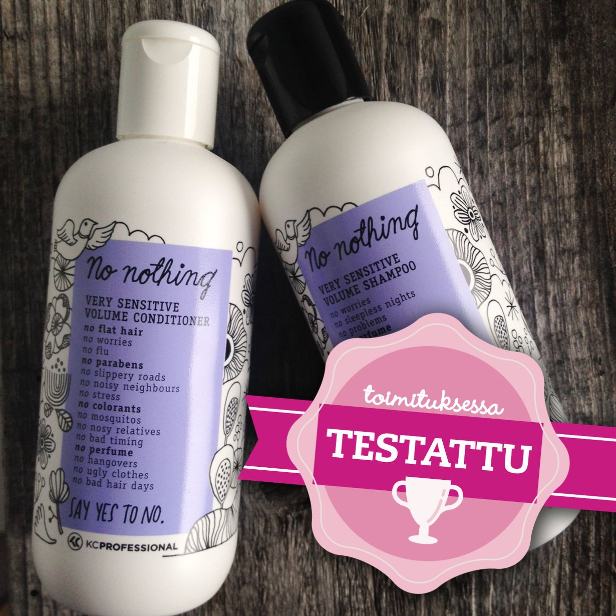Valmistaja KC Professional vakuuttaa, että No nothing Very Sensitive Volume -sampoo ja -hoitoaine antavat ryhtiä, silottavat ja kosteuttavat hentoja hiuksia. Tuuheuttavat tuotteet sisältävät "erityisen proteiiniyhdisteen" (mitä lie?) ja UV-suojan. Lisäksi niiden pitäisi suojata hiuksia "mekaanisilta vaurioilta" (joita aiheutan varmaan eniten itse). Tuotteissa ei ole hajusteita, parabeeneja eikä väriaineita.