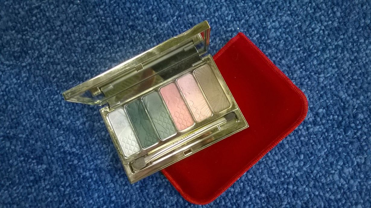 Clarinsin Garden Escape -luomiväripaletti on kausituote, jonka kerrotaan esittelevän kevään trendivärin vihreän (hyvä tietää!). Palettiin kuuluu esittelyn mukaan kuusi ”keväisen aurinkoista” (no, osittain kyllä aika tummaa) luomivärisävyä, joista osa sisältää helmiäistä. Kaikkia paletin sävyjä voi yhdistellä toisiinsa. Sävyn voimakkuutta voi säädellä käyttämällä luomiväriä joko kuivana tai kosteana. Luomiväripaletin pintaa koristaa keväinen kukkakuvio (joka oli enempi kyllä ruutua ja viivaa).