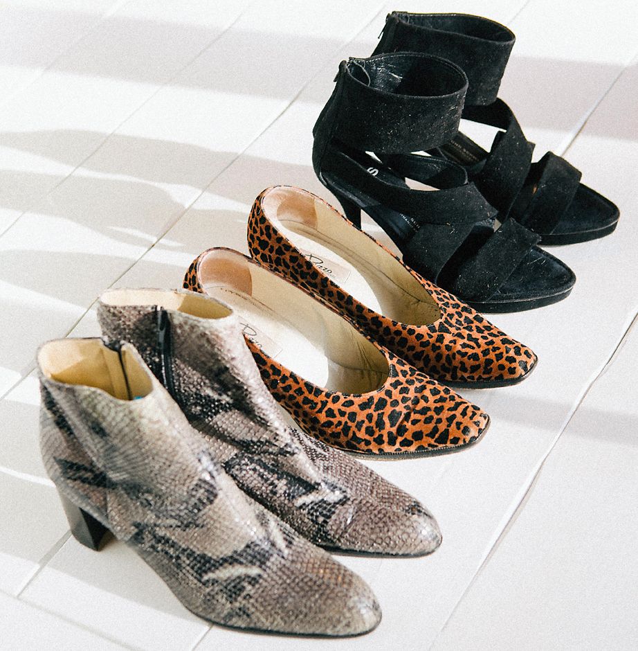 ”Käärmeennahkabootsit ja leopardikorkkarit olen löytänyt kirpputorilta muutamalla eurolla. Mustat sandaalit ostin Amsterdamista."