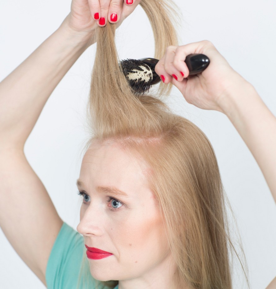 Ponnari syntyy näin: Erottele kammalla päälaelle hevosenkengän muotoinen osio. Suihkauta hiuksiin pitoa antavaa hiuspuuteria ja tupeeraa hiusosion tyvi pehmeällä harjalla.