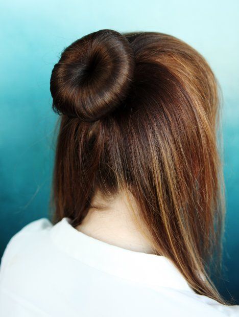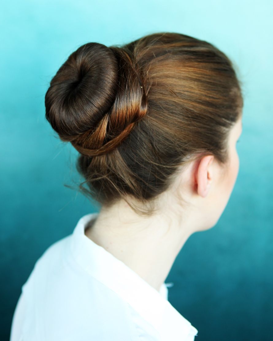 3.Pyöritä ylijääneet hiusten latvat nutturan ympärille ja kiinnitä ne hengettömillä pinneillä tiukasti nutturan tyveen.