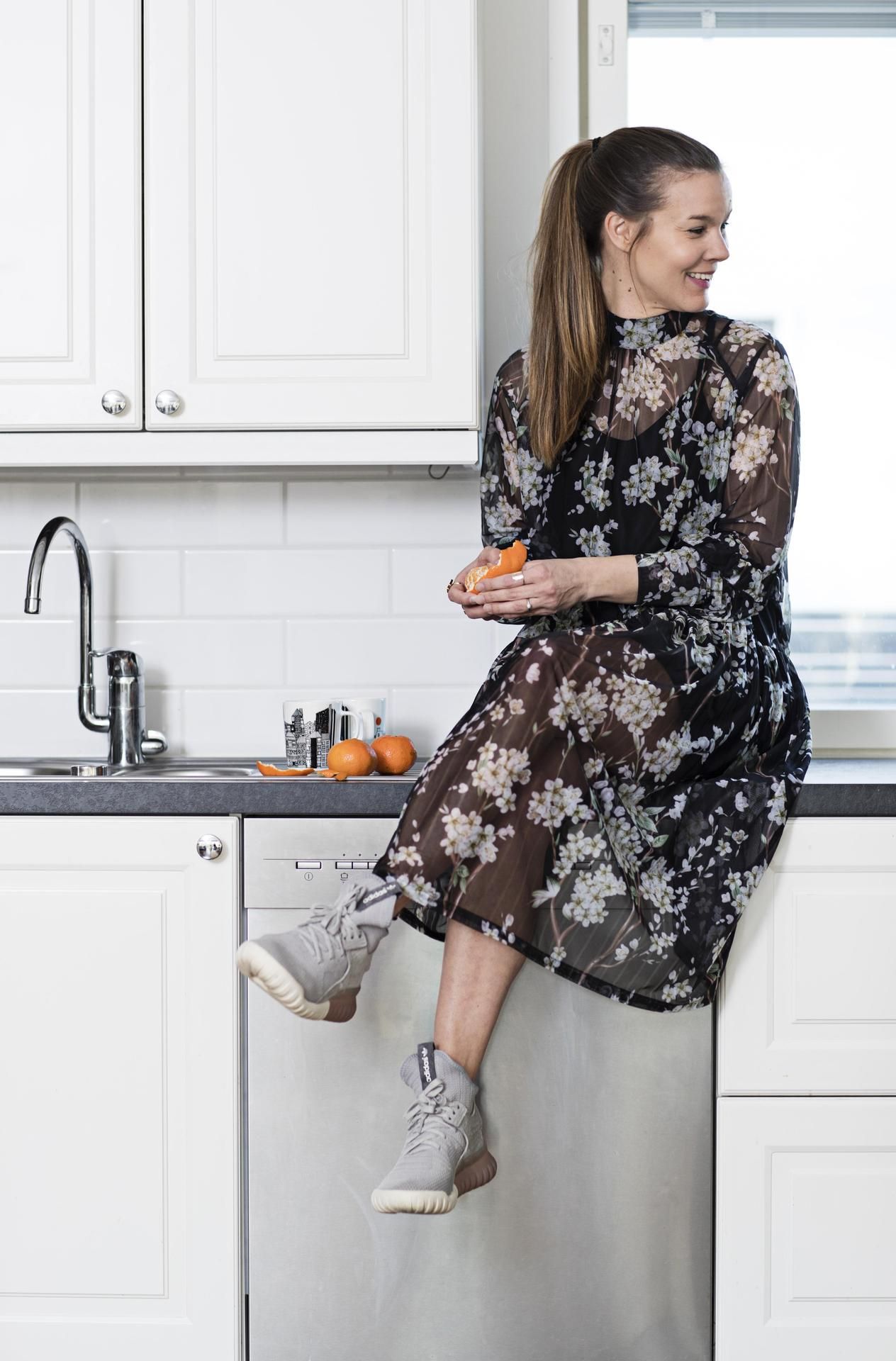 Mistä saat vaikutteita? Käyn työni vuoksi usein Tanskassa. Tanskalaiset osaavat viimeistellä tyylin, ja heidän pukeutumisensa on kivan boheemia. Suosikkikohteeni Kööpenhaminassa on tossukauppa Naked CPH, jossa myydään naisten sneakereitä. Päivitän tietojani netissä, ja Instagram on loputon inspiraation lähde.