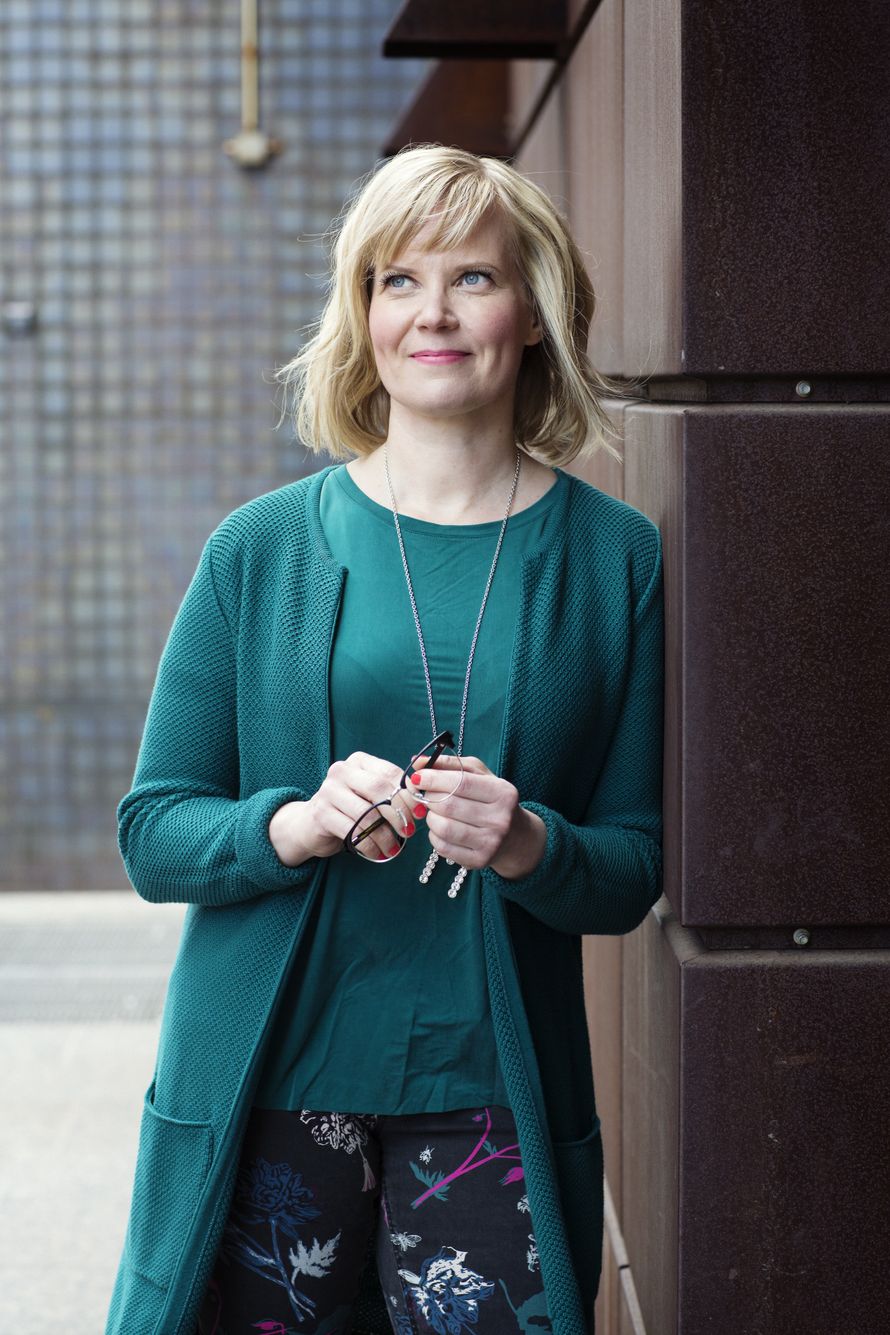 Muotitoimittaja Kaisa Virtanen esitteli Sannalle uuden lempivärin: vihreä saa hänen siniset silmänsä loistamaan. Hymy palasi Sannan kasvoille meikkitaiteilija Suvi Tiilikaisen loihdittua raikkaan luonnollisen meikin, joka korosti kuulasta ihoa.