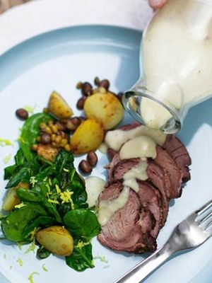 Karitsan paahtopaistia ja persilja-anjovisöljyä
