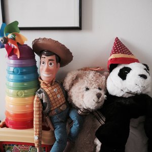 Mummun tekemä nalle pääsi kahvikutsuille huopapallomaton päälle. Täällä huoneessa yleensä pukeudutaan ystävien kanssa "roolivaatteisiin" ja kioskissa leikitään kotia, kahvilaa tai kauppaa. Aamuisin on saatu usein herätä kahvipannun kilistelyyn ja herkkujen leipomiseen! Ja monesti on saatu myös "aamupala" suoraan sänkyyn!