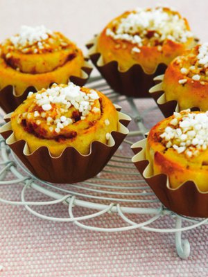 6. Tee kookosvoisilmät osaan pullista. Paista loput pullat sellaisenaan ja tee niille jälkikäteen tomusokerikuorrutus.