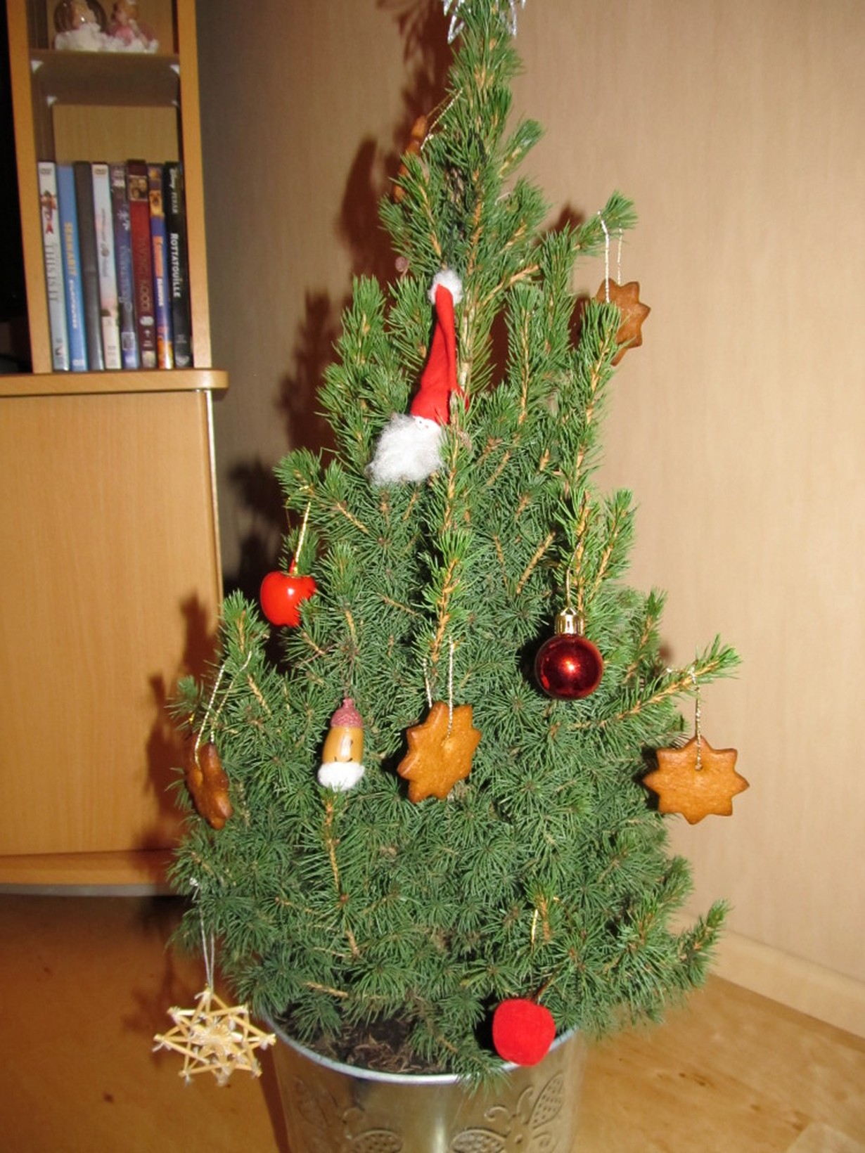 Äiti ja isä toivat joulukukan asemasta meille minikuusen, joka koristeltiin pipari- ja omenakoristein.