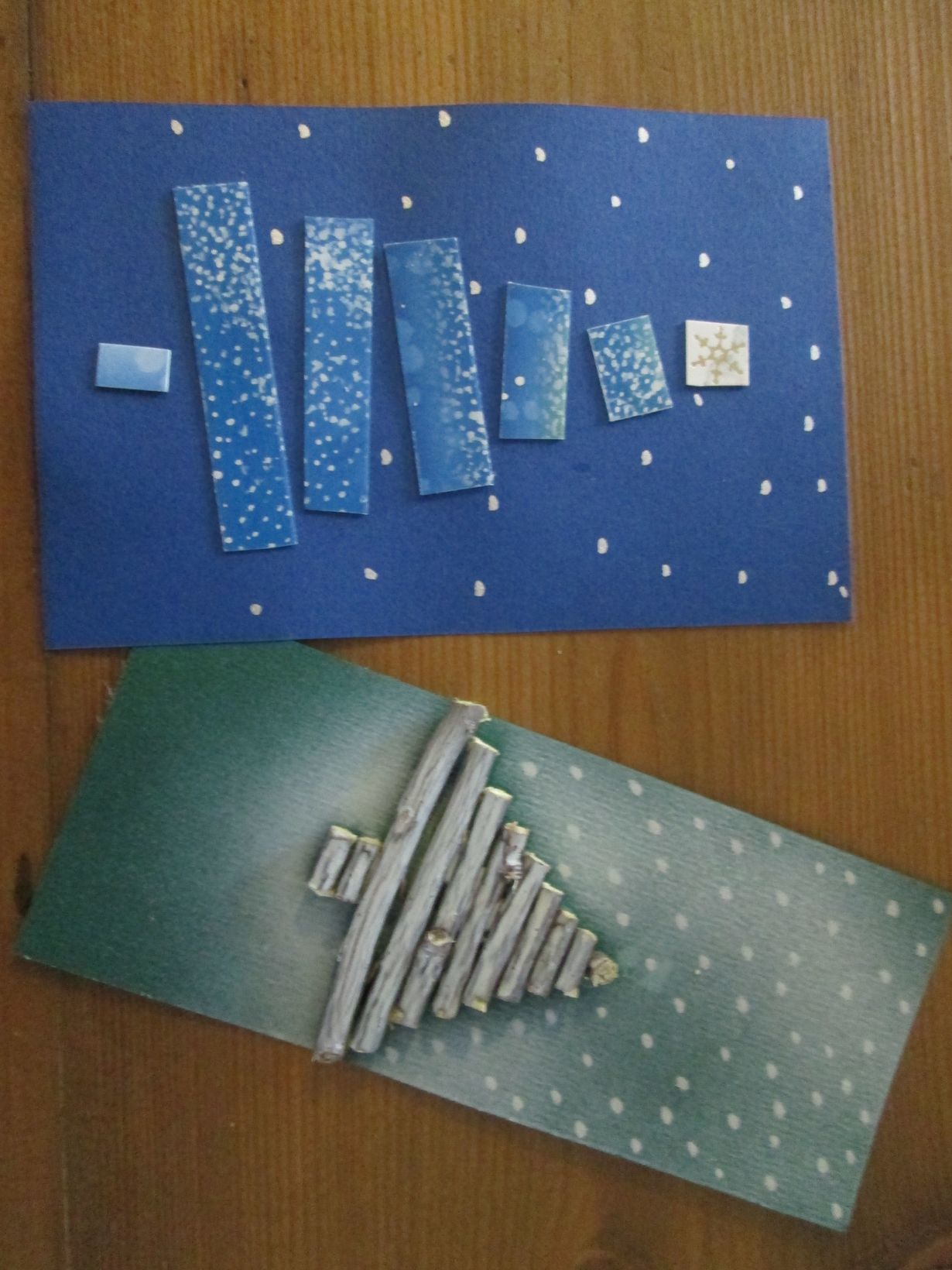 Kuusiaihe inspiroi vuodesta toiseen. Vihreällä pohjalla olevaan korttiin kuusi rakentui pajunoksista, hopeatussin lumihiutaleista ja päälle suihkaus valkoista spraymaalia - näitä lähettelin muutama vuosi sitten. Siniseen korttiin tuunasin kuusen vanhoja valmisjoulukortteja leikkelemällä ja lumihiutaleet taas hopeatussilla - näitä lähtee eteenpäin tänä vuonna :)