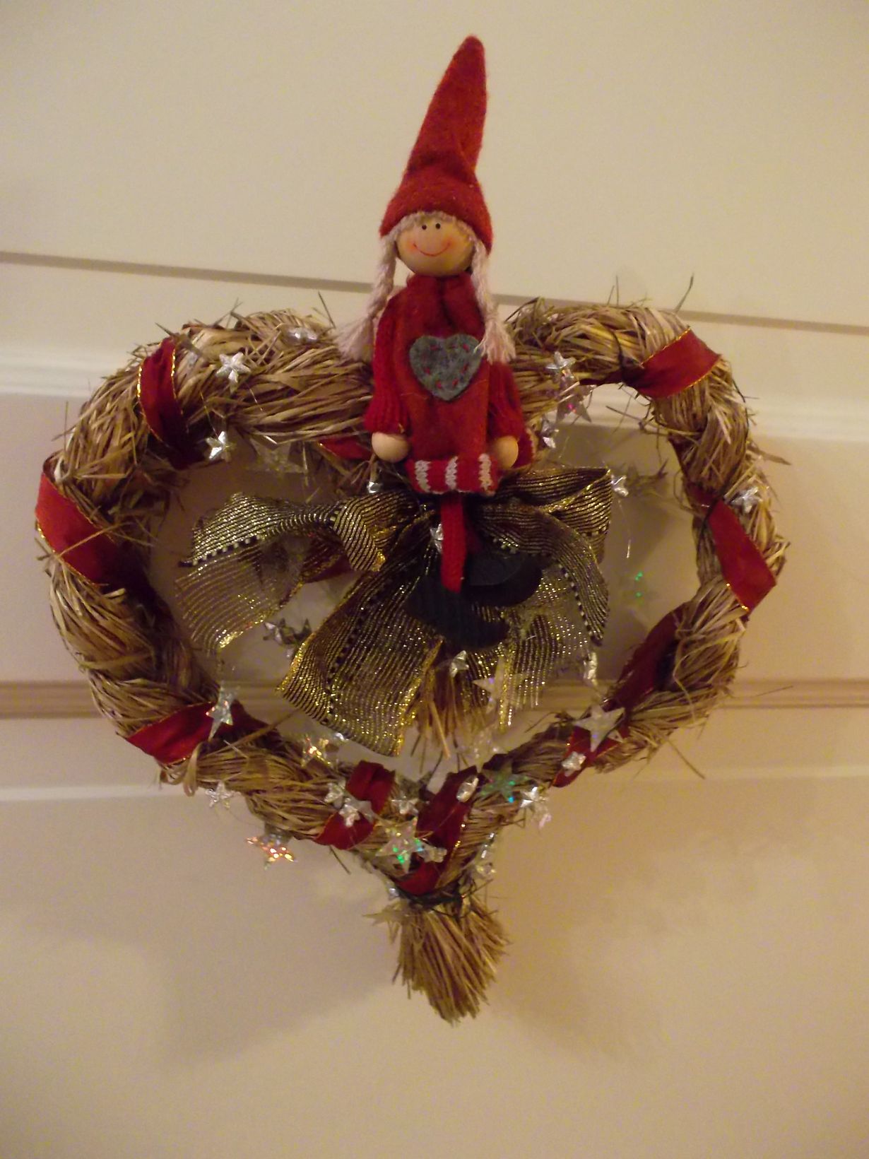 Keräsin kesällä heinää ja letitin niistä sydämen muotoisen pohjan. Koristeina vanha tonttu ja pieniä hopeatähtiä sekä erilaisia nauhoja.