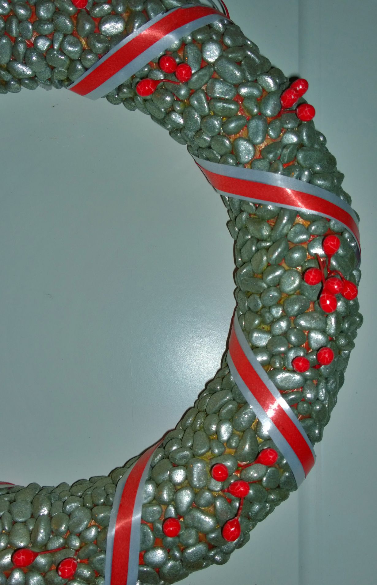 Jo useamman vuoden palvellut ovikranssi, näperrelty hopealla maalatuista pikkukivistä ja kukka-asetelmista kierrätetyistä koristeista.