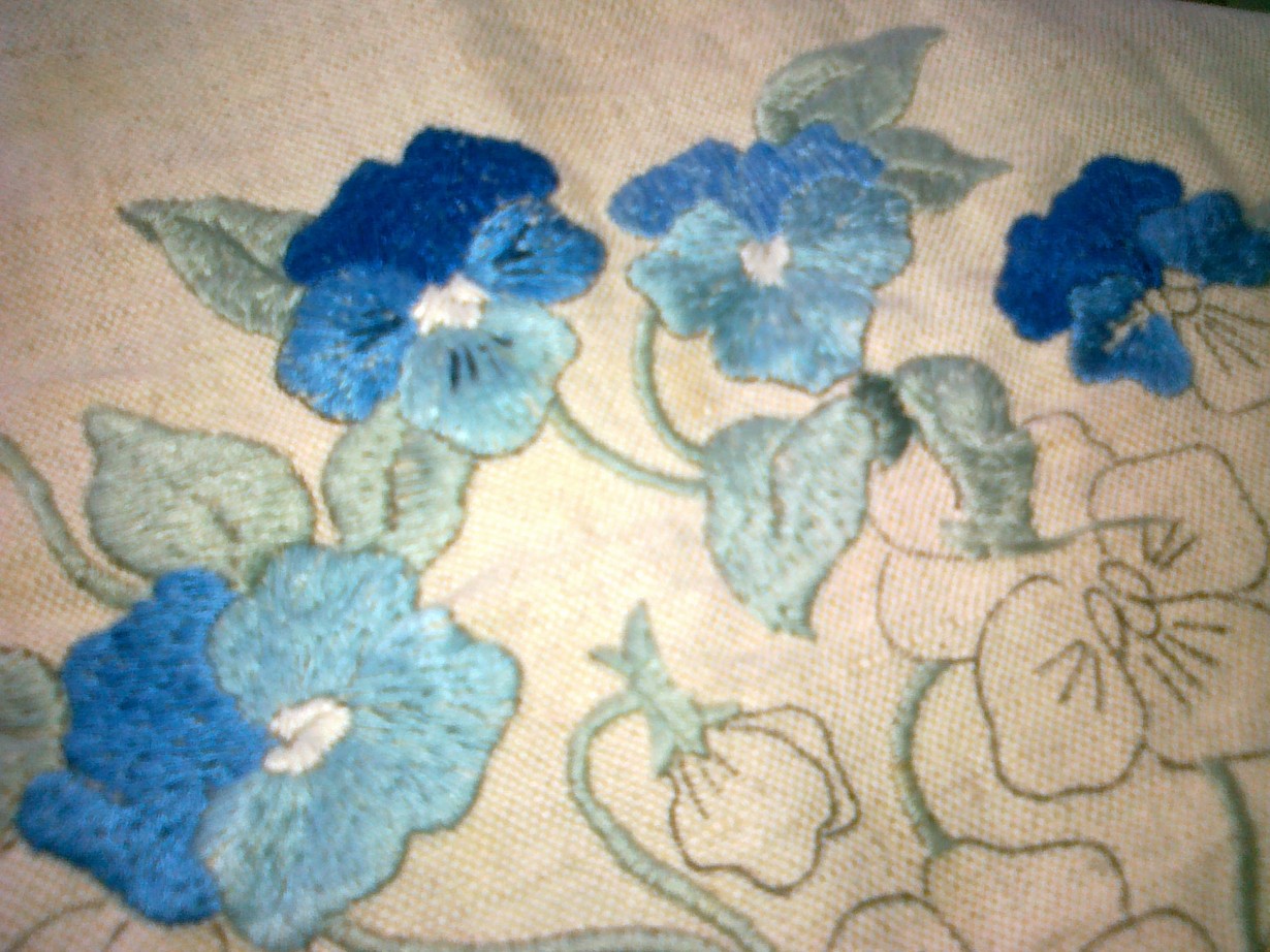 Sinisiä muliinilangalla kirjottuja orvokkeja