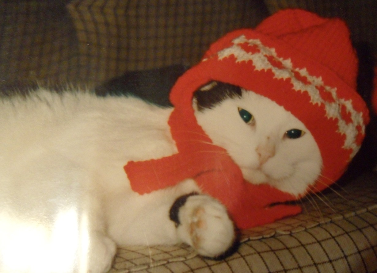 Neuloin pienelle kummitytölleni pipon. Minttu-kissani toimi mallinukkena.