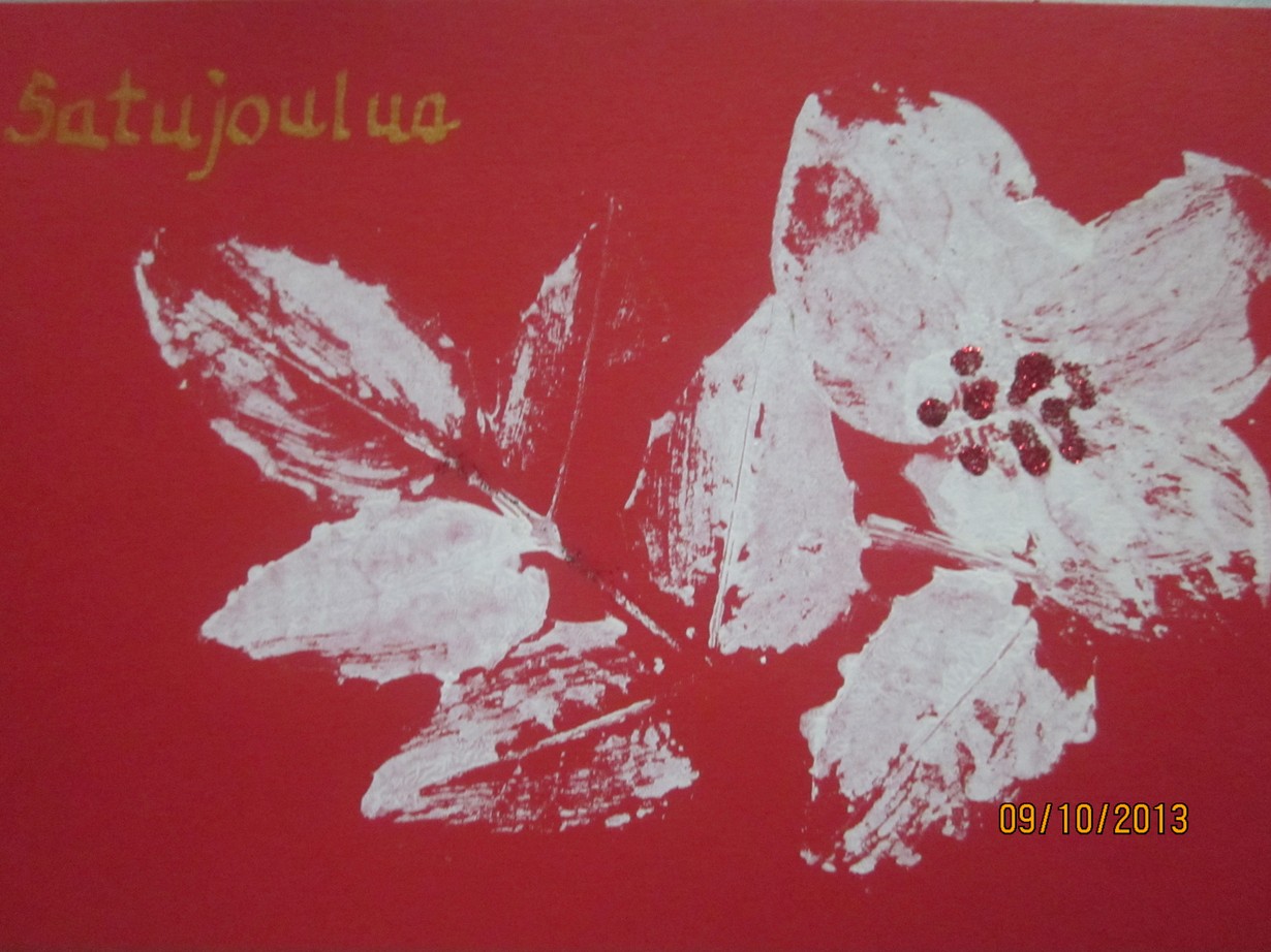 valmistusresepti: Mistelinoksa joka on mahonianlehti, kukkaan ruusunlehtiä, valkoista lumimaalia ja punaista kimallushilettä, valkoista maalia ja punainen kartonki