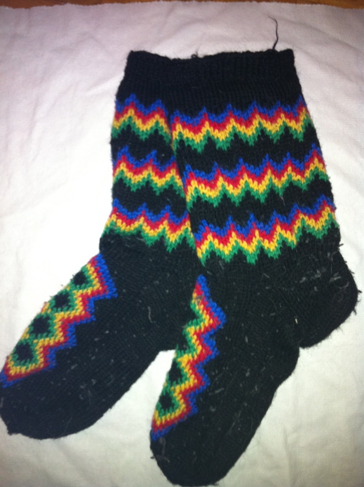Lapin mummini tekemät villasukat, jotka ovat olleet kovassa käytössä. Mummini kuoltua monta vuotta sitten, olen säästänyt sukkia, koska hän ei ole enää tekemässä minulle uusia sukkia.