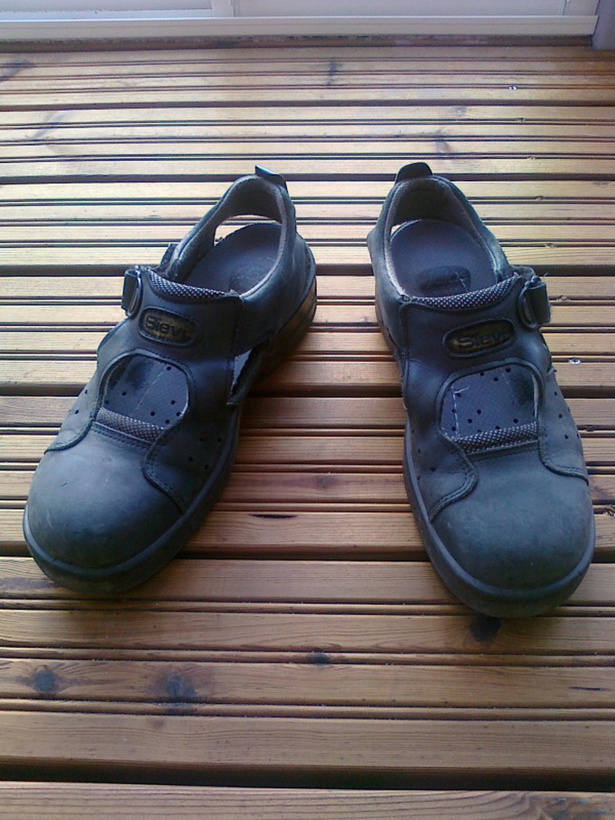 Nämä kengät olen saanut kymmenisen vuotta sitten opiskeluun liittyvässä kesätyössä, jossa käytettiiin turvavarusteita. Yksikön varuste vastaava oli kesätyöni loppuvaiheessa tilannut erilaisia rensseleitä. Nämäkin tulivat mukaani käyttämättöminä lopettaessani. Joten olen näitä käyttänyt arkikenkinäkin, sen verran mukavat ovat jalassa.