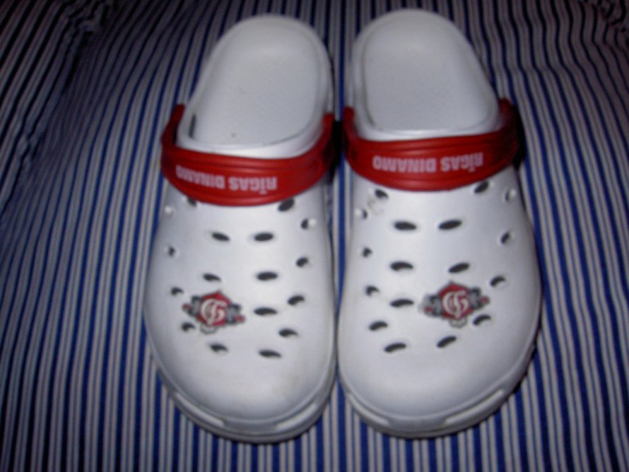 Toissa syksynä löysin Riiasta ihan tavallisesta tavaratalosta paikallisen jääkiekkoseuran Riian dynamon fanitavarahylly, josta huomasin oitis nämä ihanat crocsit. Puutarhakengiksi ne ajattelin, mutta kun ovat valkoiset, en sitten lopulta ole raskinut puutarhatöissä käyttää, muuten kylläkin tallustelen niillä mieluusti.