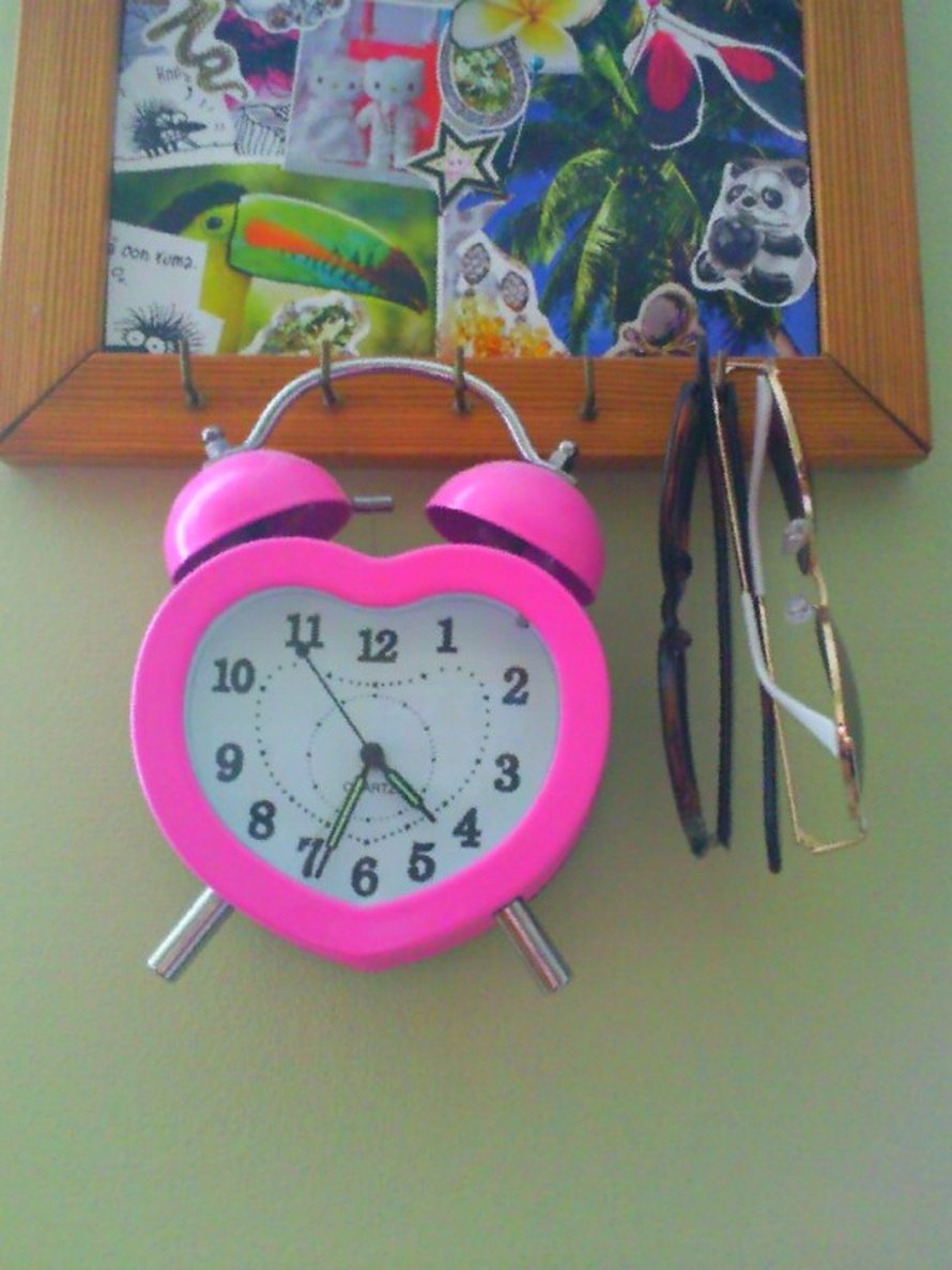 Sain kellon mummoltani, kun muutin omaan asuntoon. En omista yöpöytää, mutta keksin sille oivan paikan imoitustauluni naulakosta.