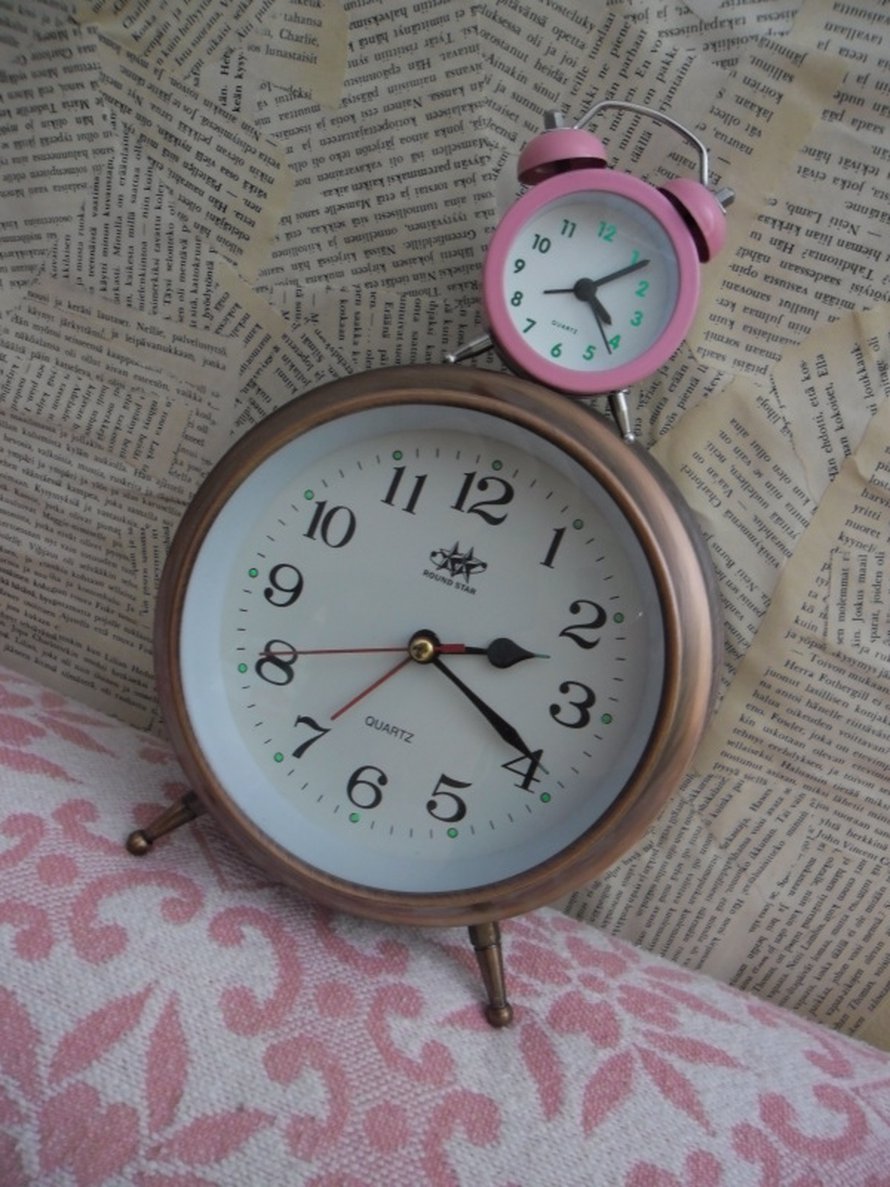 Ylempi pikkuinen kello on ale löytä lempiliikkeestäni ja alempi on perintökello mummoltani. Kellot kuvastavat tyyliäni täydellisesti. Minulla on kaksi herätyskelloa siksi, että pelkään ettei kelloni soikaan ja myöhästyn menoistani. Toinen kello toimii myös kätevästi torkkukellona.