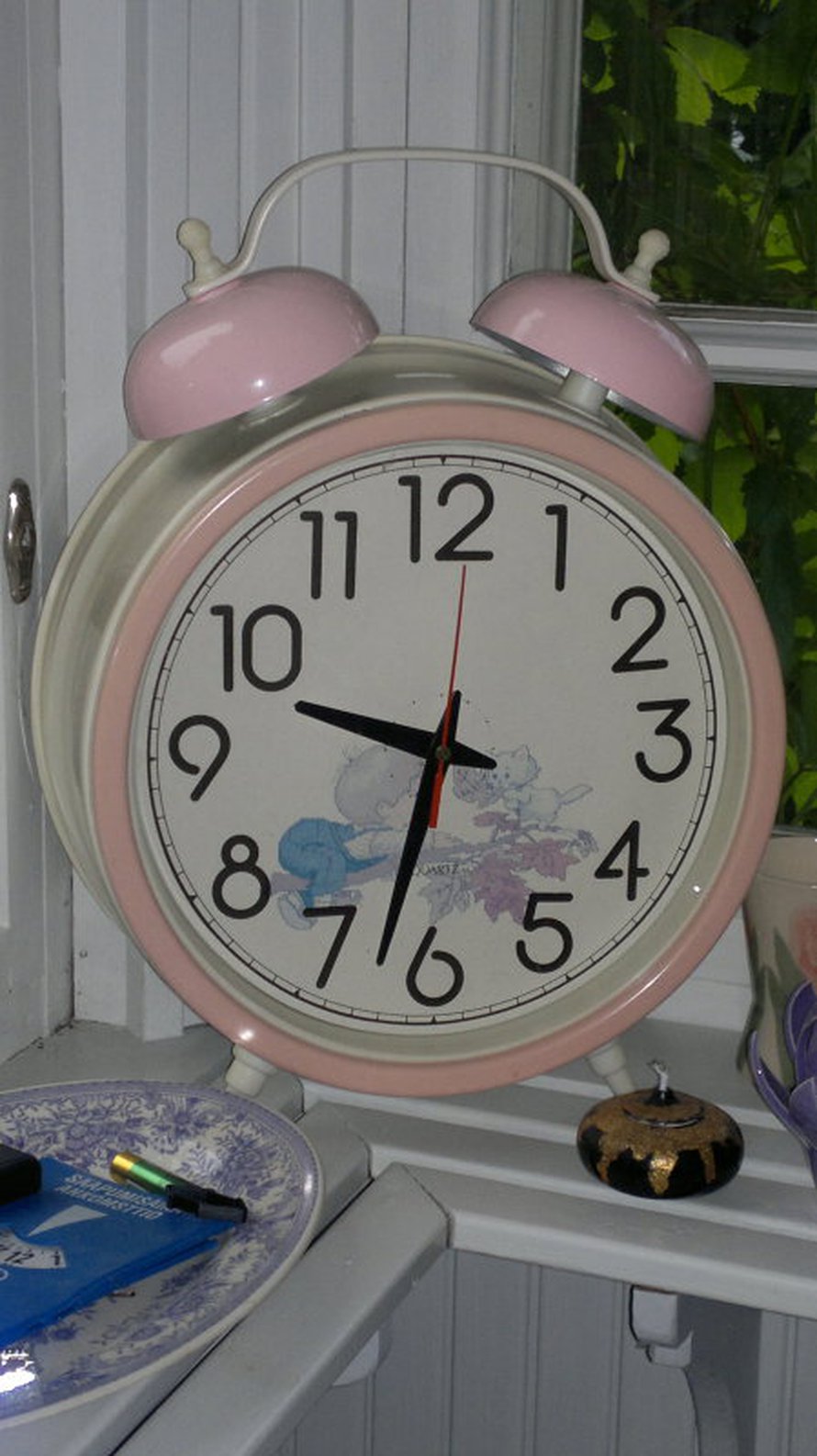 Saimme herätyskellomme mieheni äidiltä, kun muutimme uuteen kotiin. Kello on halkaisijaltaan melkein puoli metriä.