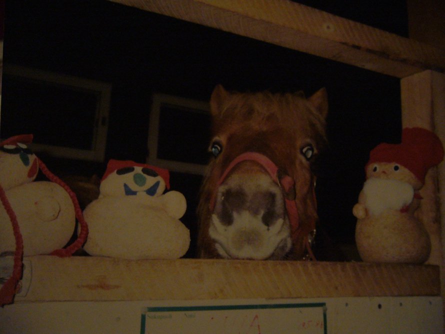 Shetlanninponi Lina poseeraa vähän hassusta kuvakulmasta kauratäytteisten tonttujen kanssa. Kovasti olisi tehnyt mieli maistaa tonttuja.